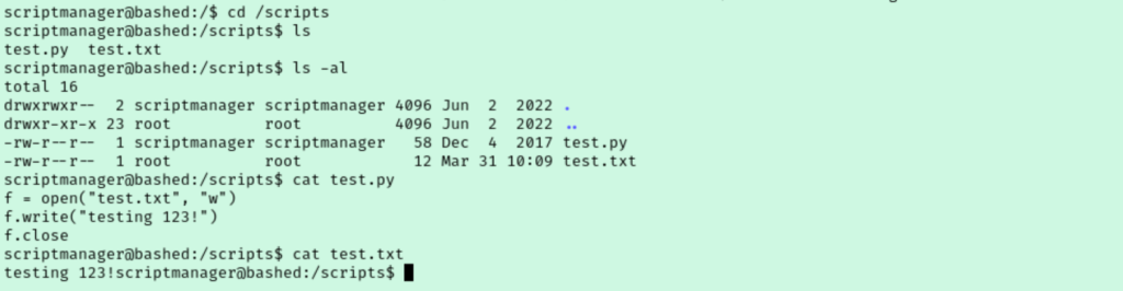I couldn’t check this users sudo rights so I just jumped to running linpeas as the current user. Under the “Unexpected in root” section of the results we see a directory named /scripts. Seeing as we are “scriptmanager” this lead seems promising. Here we find two files, a python script and a txt file.