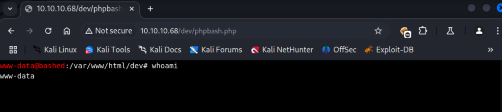 Most of these didn’t have anything interesting. /php is a directory which could come in handy. /dev has the phpbash app which was mentioned by the site. Clicking on the phpbash file here opens a webshell we can start exploring.