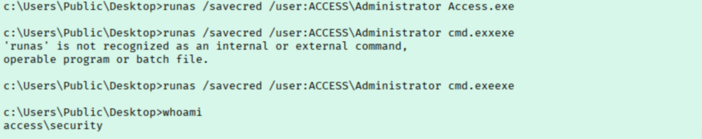 I tried running Access.exe once using this method to see if it needed to cache the credential first. This seemed to work, since I didn’t get prompted for the password but I didn’t get elevated shell.
