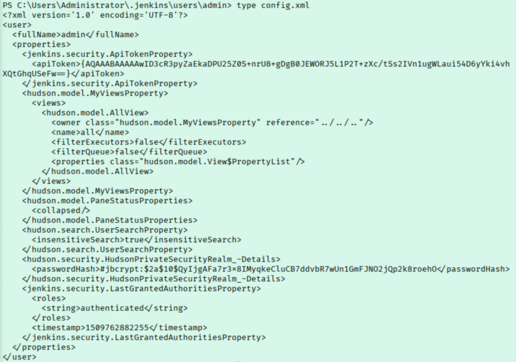 This article had a lot of great information. This shows the master key is just part of what we need, but I can’t find a credentials.xml file. Inside users/admin/ I found a config.xml file with a password hash, although this may be the password we already have.