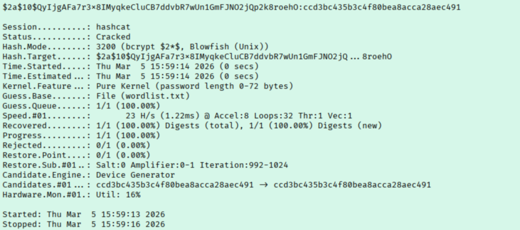 To make sure we aren’t wasting our time, I put the known password into a wordlist by itself and attempted to crack.