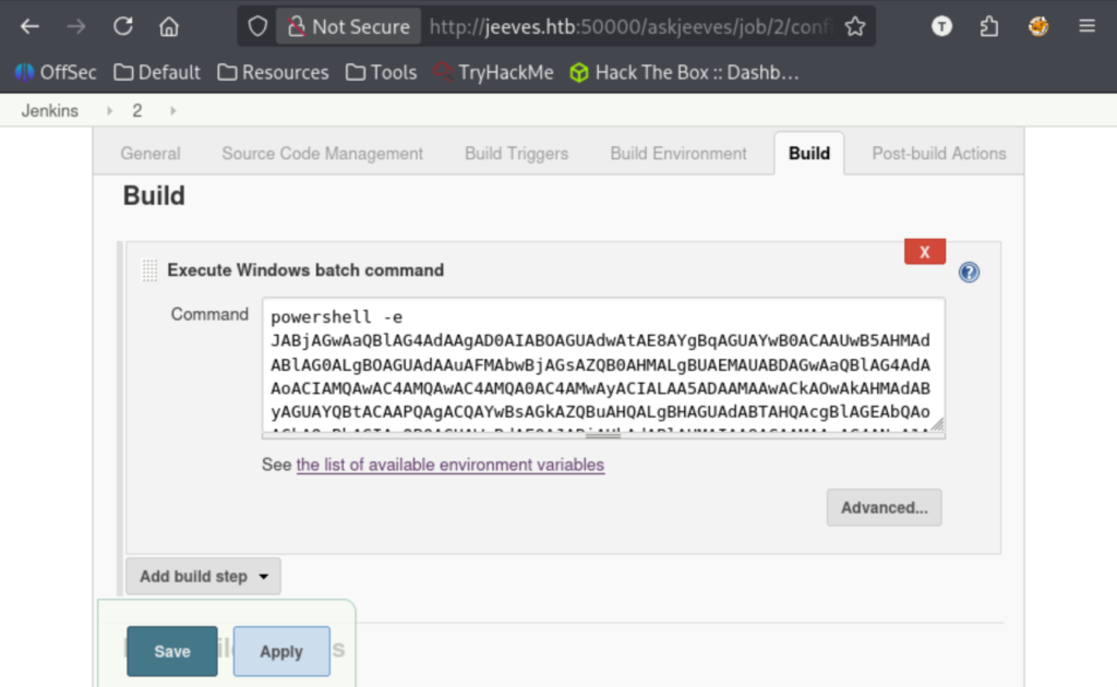 After saving and hitting Build Now, it failed. Going over the config again, I realized that I was doing a bash reverse shell against a windows target. Whoops. I switched the execution shell to a windows batch command and used various powershell payloads off revshells.com, eventually landing on the ‘Powershell #3 (Base64)’ version.