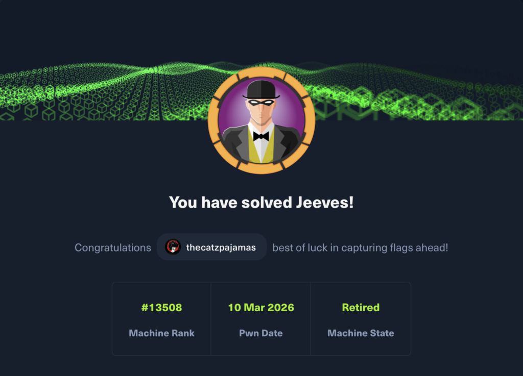 Next up on my way through TJ Null’s OSCP prep list, we have Jeeves on Hack the Box. This is Medium difficulty and a Windows machine, so I suspect I may struggle a bit with this one. Here we go.